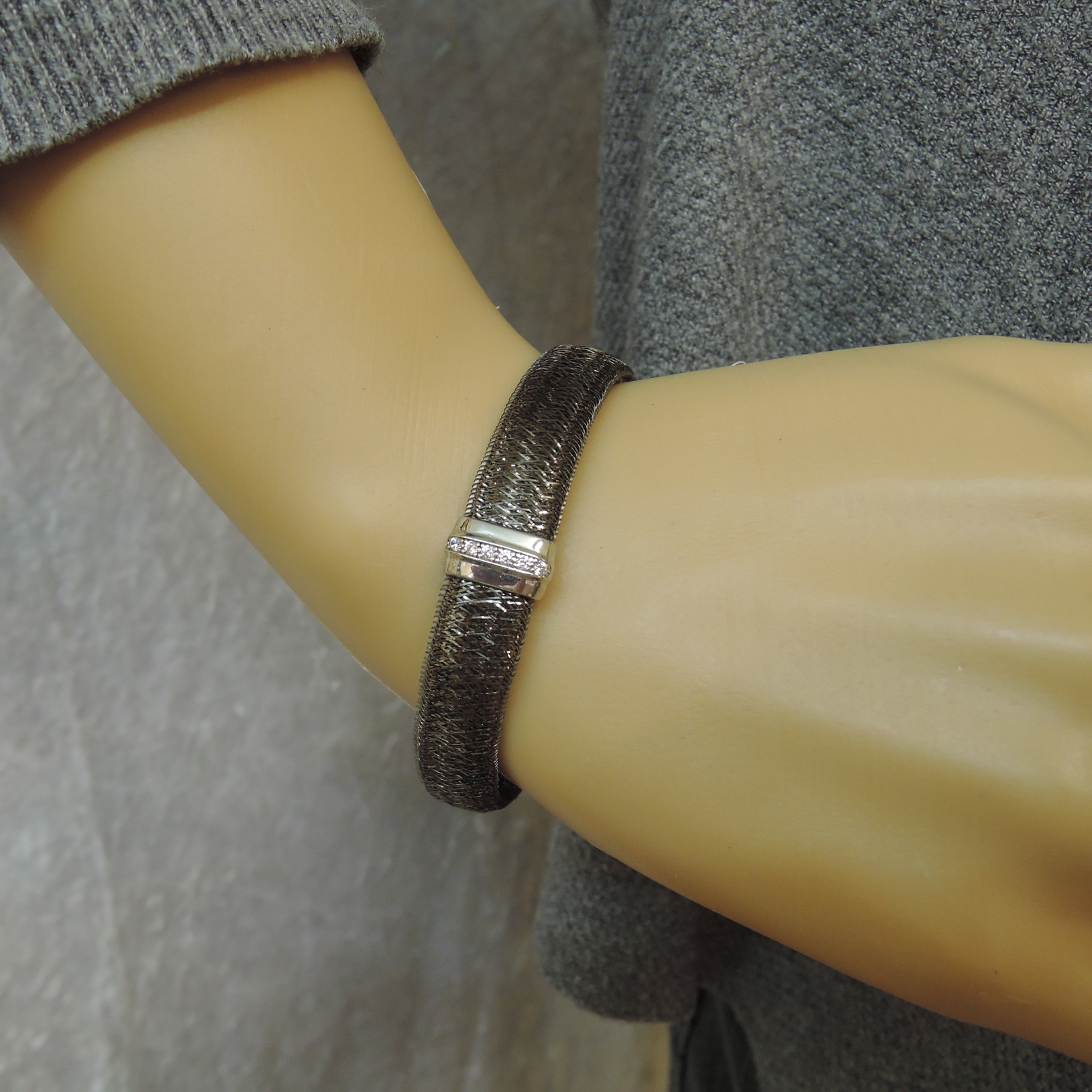 Aufwendig gearbeitetes Armband aus schwarz rhodinierten Silberfäden schwarz rhodiniert mit Zirkonia Steinen besetzt. Das Armband ist dehnbar von ca.18 - 20 cm.