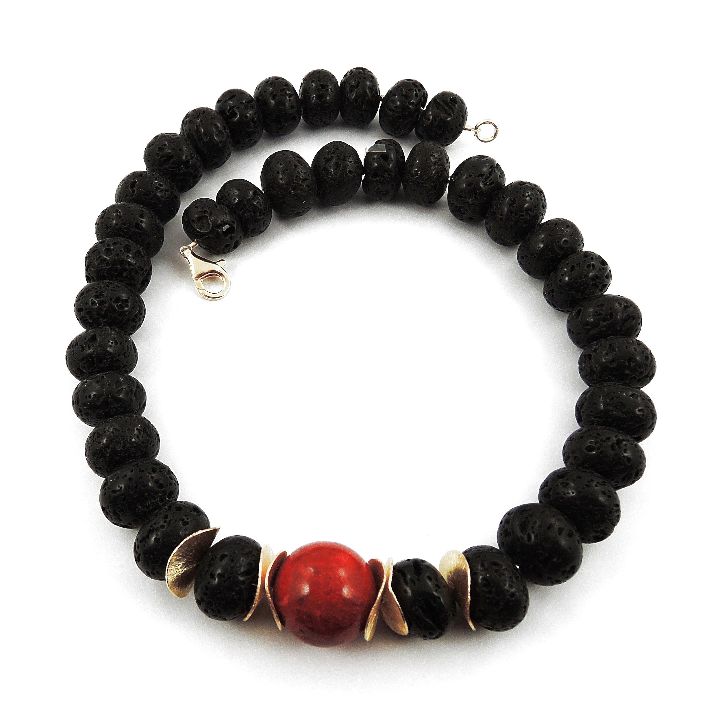 Edelsteinkette Lava Linsen, ca. 17 x 12 mm, Schaumkoralle Kugel ca 20 mm und silbervergoldeten Zwischenteilen.