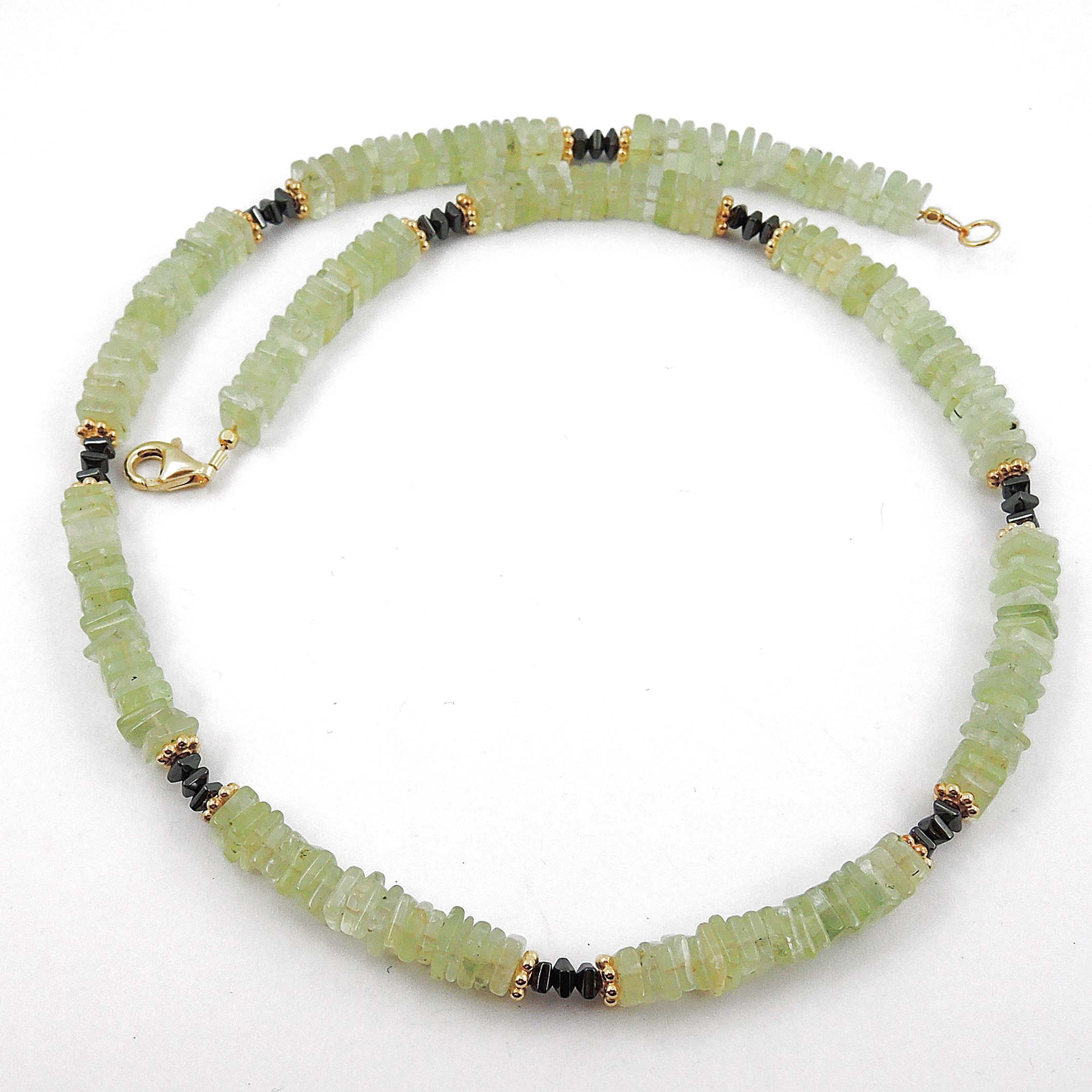 Kette aus Prehnit Scheiben ca.5 x 5 mm mit Hämatit Zwischenteilen eingerahmt mit Silber vergoldeten Teilen.