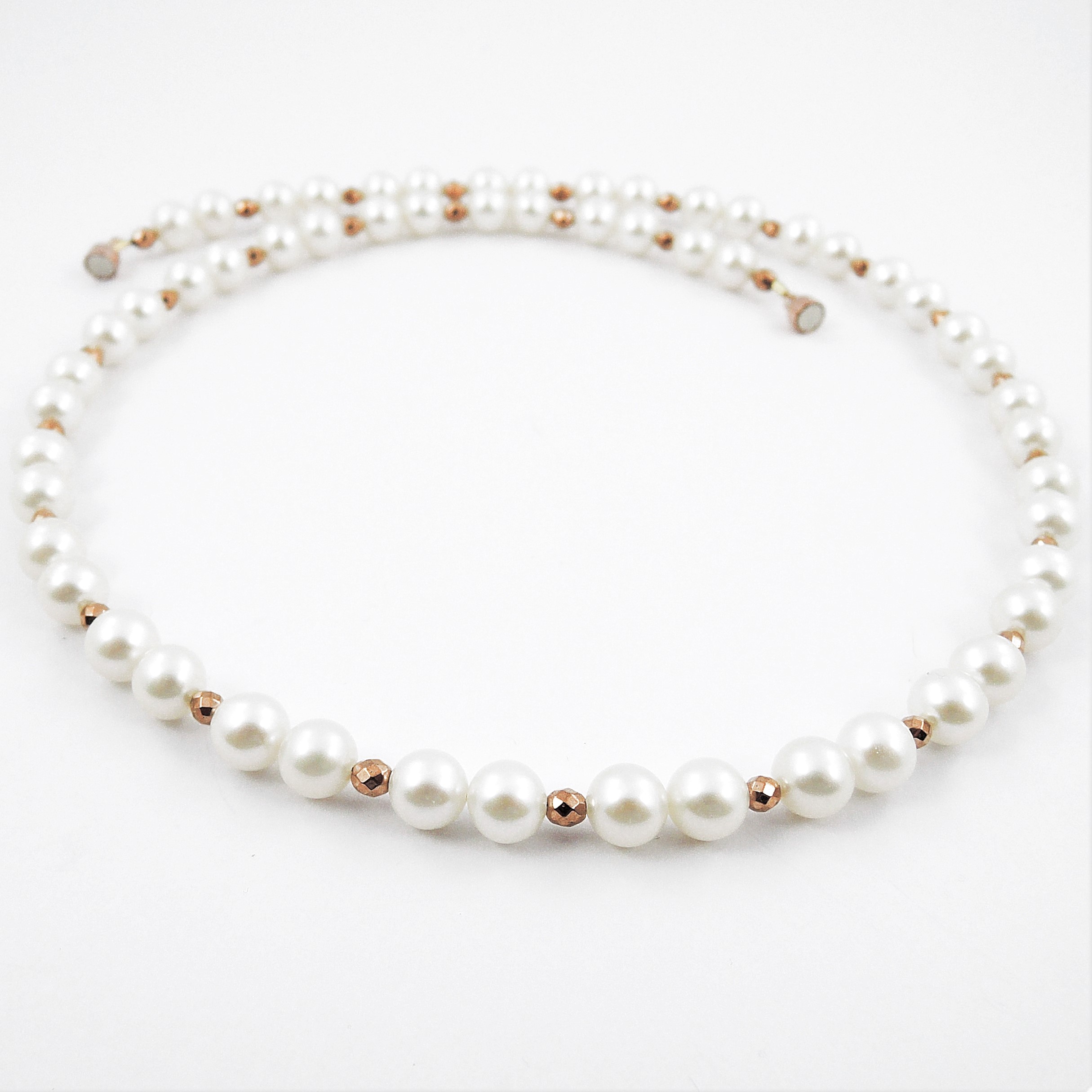Süßwasser-Perlenkette mit facettierten Hämatin-Zwischenteilen.