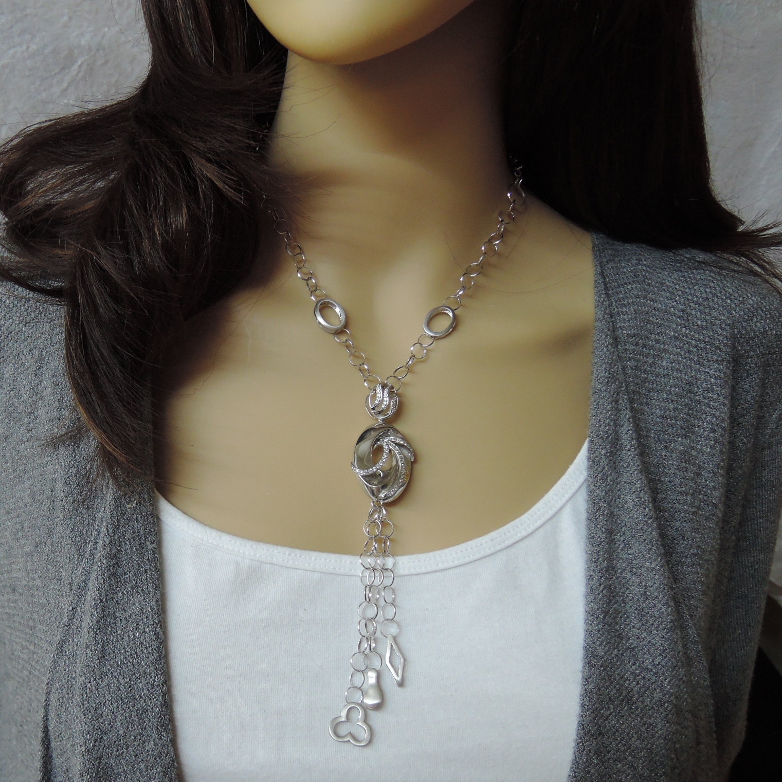 Silbercollier, rhodiniert, Knotenform mit Zirkonia, Länge ca. 42 cm, Anhänger mit Kettchen ca. 13 cm Länge.