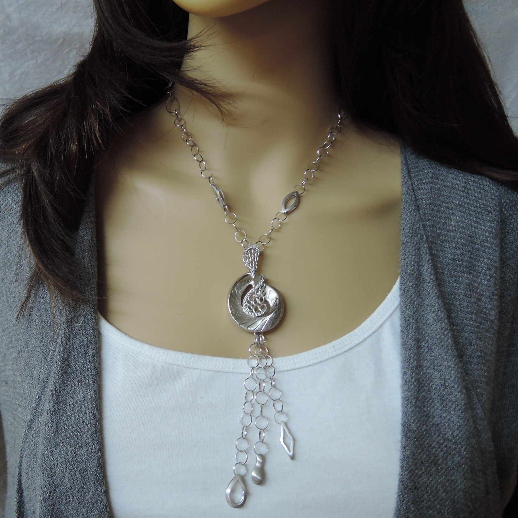 Silbercollier, rhodiniert, Muschelform mit Zirkonia, Länge ca. 42 cm, Anhänger mit Kettchen ca. 13 cm lang.
